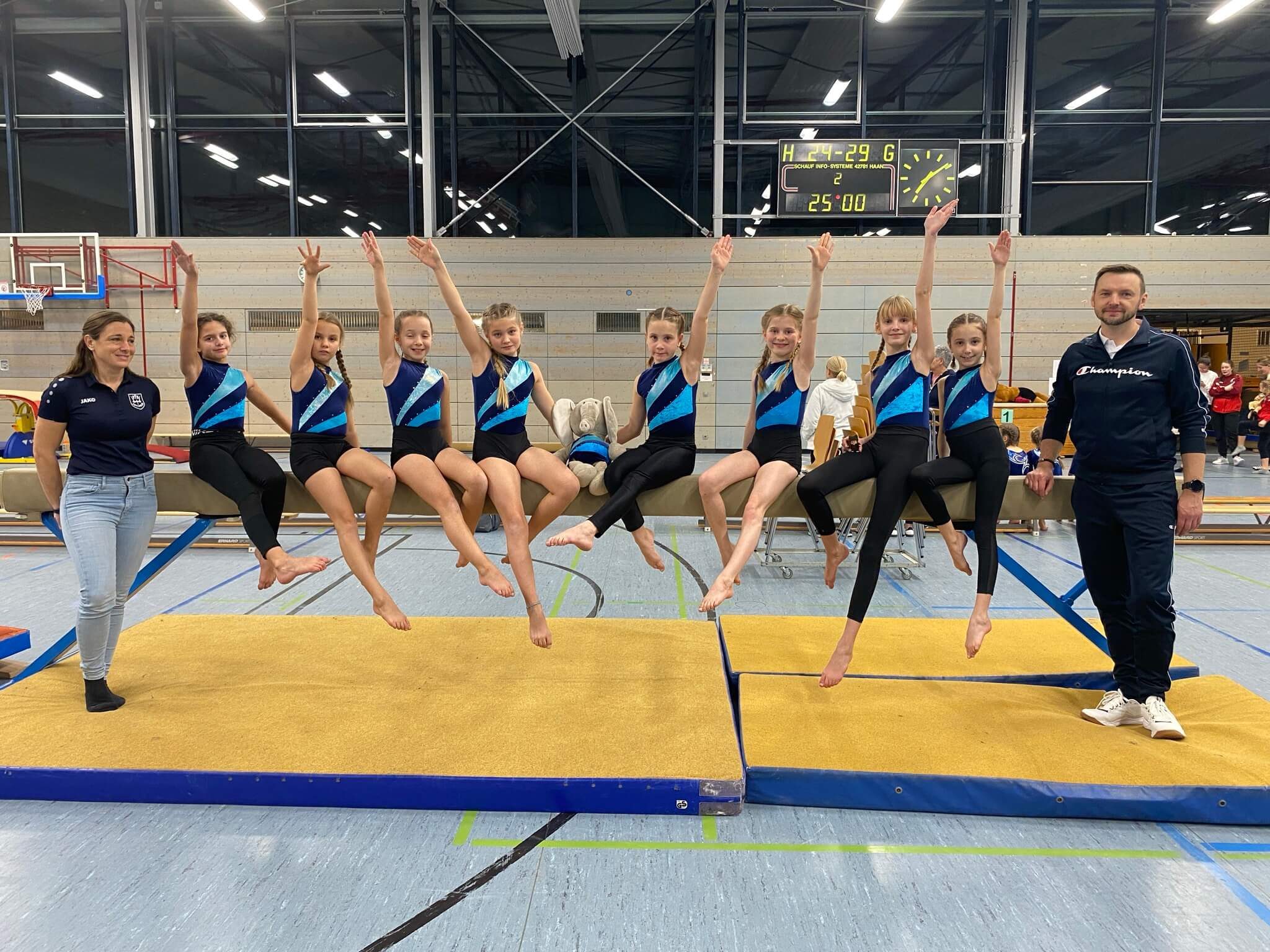 Dieses Jahr traten 384 Teilnehmerinnen in 100 Teams aus 16 Vereinen an. Mit je zwei Teams in der AK 10 und 13. traten wir als VfB Kipfenberg an. Einen großartigen 3. Platz und damit auf dem Podium stehen konnte in der AK 13 das Team Kipfenberg I mit Magdalena Fray, Pia Fischer, Sophia Stoß, Leni Becker und Eva Stadler. Kipfenberg II belegte den 10. Platz und in der AK 10 wurde Kipfenberg I 6. und Kipfenberg II 11. Platz. Es mussten alle vier aus fünf Geräte (Balken, Boden, Reck, Sprung, Minitrampolin) geturnt werden. Sie traten mit ihren Trainern Florian Hackner und Mike Röske sowie der Betreuerin Anna Brucks